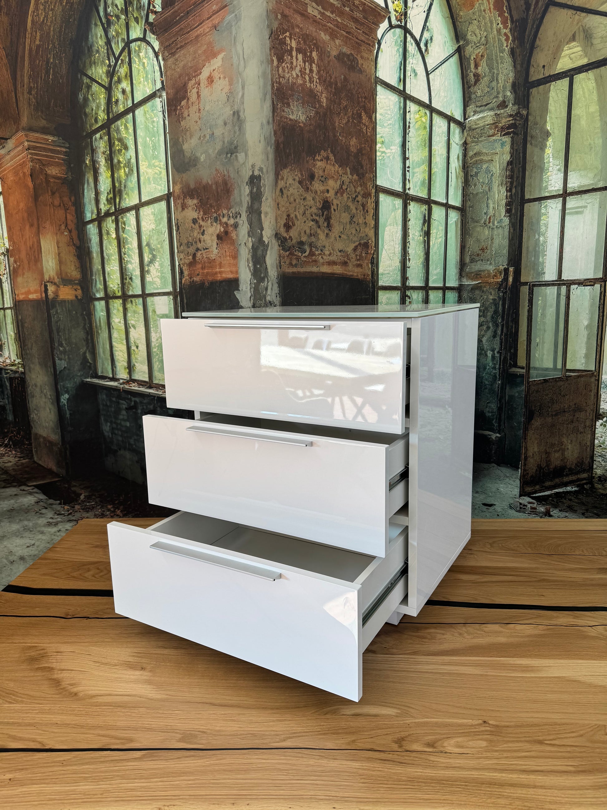 Nachttisch Kommode +Glas Auflage +3xSchubladen +Hochglanzweiß +Neu auf Lager